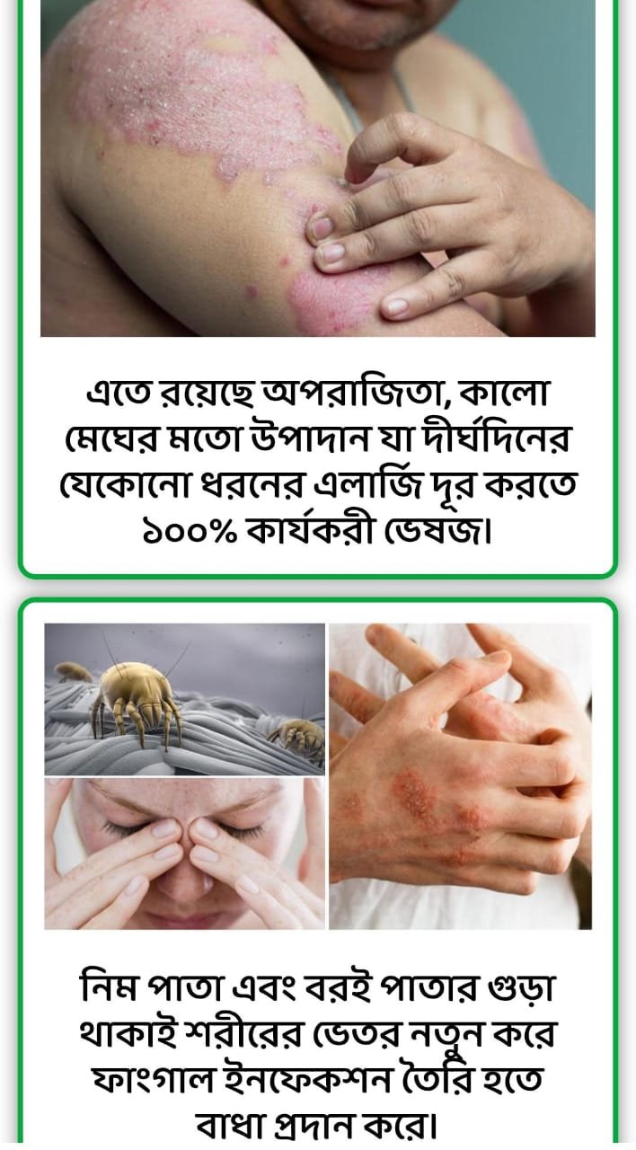 এটা সেবনে রক্তের ভিতরে থাকা এলার্জির জীবাণু গুলো চিরতরে ধ্বংস করে আপনাকে দিবে সকল প্রকার চুলকানি ও এলার্জি থেকে স্থায়ী সমাধান – এটা শতভাগ গ্যারান্টি।
