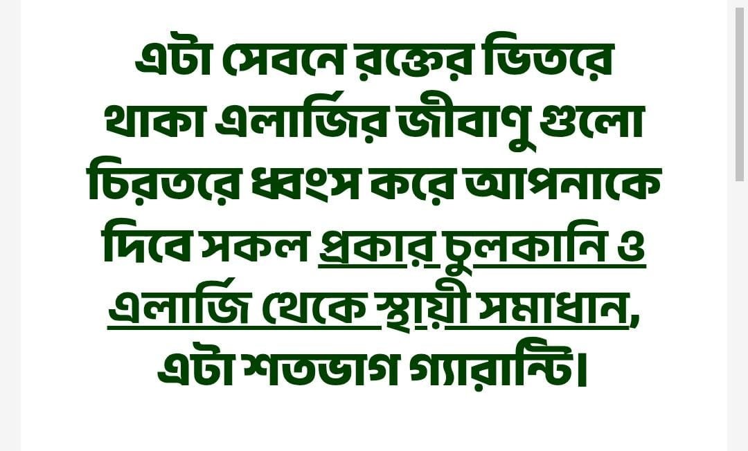 এটা সেবনে রক্তের ভিতরে থাকা এলার্জির জীবাণু গুলো চিরতরে ধ্বংস করে আপনাকে দিবে সকল প্রকার চুলকানি ও এলার্জি থেকে স্থায়ী সমাধান – এটা শতভাগ গ্যারান্টি।